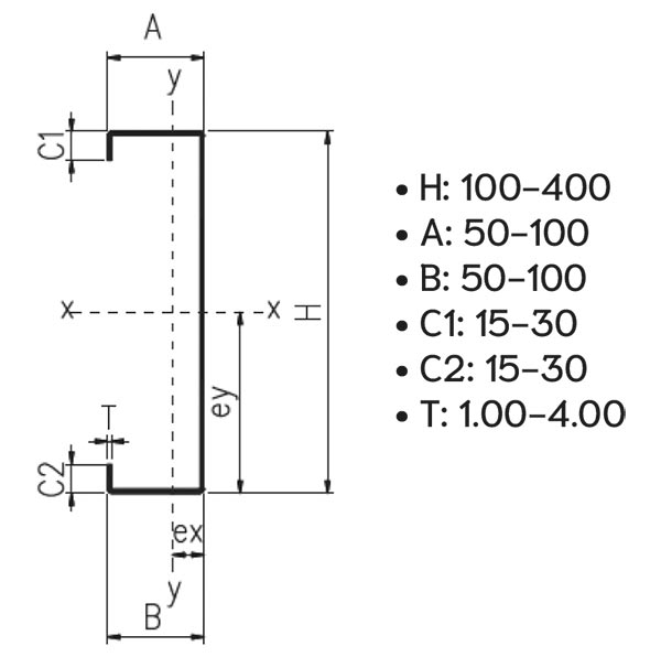 İŞLENMİŞ ÜRÜNLER - C AŞIK PROFİLLER AVRUPA KESİT GENİŞ BAŞLIKLI PROFİLLER HEA – HEB – HEM 100 – 1000mm HEA-HEB-HEM Profiller Tablosu HEA Profiller HEB Profiller AVRUPA KESİT PARALEL BAŞLIKLI PROFİLLER IP 80 – 750 IPE Profiller Tablosu AVRUPA KESİT PARALEL BAŞLIKLI I VE U PROFİLLER UPE 80 – 400 UPE Profiller Tablosu AVRUPA KESİT EĞİK FLANŞLI I VE U PROFİLLER IPN 80 – 600 IPN Profiller Tablosu UPN 40 – 400 UPN Profiller Tablosu TİCARİ PROFİLLER Eşit Kenar Köşebentler Köşebentler Tablosu Eşit Kenarlı T Profiller Eşit Kenarlı T Profiller Tablosu Lamalar Lamalar Tablosu Kare Demiri YASSI ÇELİK ÜRÜNLER SICAK Sıcak Levha Sıcak Levha Tablosu Sıcak Rulo ve Paket Saclar Baklavalı Gözyaşı Desenli Saclar Baklava Gözyaşı Desenli Saclar Tablosu YASSI ÇELİK ÜRÜNLER SOĞUK Rulo ve Paket Saclar Rulo ve Paket Saclar Tablosu YASSI ÇELİK ÜRÜNLER GALVANİZ Galvaniz Rulo ve Paket Saclar Galvaniz Rulo ve Paket Saclar Tablosu Galvaniz Boyalı Saclar Rulo ve Paket Saclar Galvaniz Boyalı Saclar Tablosu BORU PROFİLLER Siyah Boyalı Galvaniz Borular Siyah Boyalı Galvaniz Borular Tablosu Siyah Boyalı Galvaniz Kutu Profiller Siyah Boyalı Galvaniz Dikdörtgen Profiller GAZ, SU VE DOĞALGAZ BORULARI Gaz, Su Boruları Doğalgaz Boruları Gaz, Su ve Doğalgaz Boruları Tablosu SERA OLUKLARI İŞLENMİŞ ÜRÜNLER Petek Kirişler Trapez Saclar Çatı C Aşık Profiller C Aşık Profiller Tablosu ÖZÇE HİZMETLER • H: Yükseklik/Height • A: Üst kenar yüksekliği / Upper Flange Height • B: Alt kenar yüksekliği / Lower Flange Height • C1: Üst tırnak genişliği / Upper lip width • C2: Alt tırnak genişliği / Lower lip width • T: Kalınlık / Thickness
