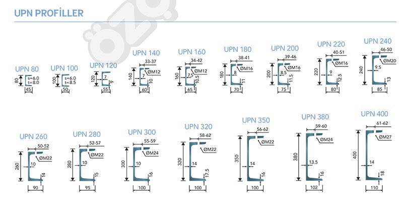 UPN PROFİLLER TABLOSU AVRUPA KESİT GENİŞ BAŞLIKLI PROFİLLER HEA – HEB – HEM 100 – 1000mm HEA-HEB-HEM Profiller Tablosu HEA Profiller HEB Profiller AVRUPA KESİT PARALEL BAŞLIKLI PROFİLLER IP 80 – 750 IPE Profiller Tablosu AVRUPA KESİT PARALEL BAŞLIKLI I VE U PROFİLLER UPE 80 – 400 UPE Profiller Tablosu AVRUPA KESİT EĞİK FLANŞLI I VE U PROFİLLER IPN 80 – 600 IPN Profiller Tablosu UPN 40 – 400 UPN Profiller Tablosu TİCARİ PROFİLLER Eşit Kenar Köşebentler Köşebentler Tablosu Eşit Kenarlı T Profiller Eşit Kenarlı T Profiller Tablosu Lamalar Lamalar Tablosu Kare Demiri YASSI ÇELİK ÜRÜNLER SICAK Sıcak Levha Sıcak Levha Tablosu Sıcak Rulo ve Paket Saclar Baklavalı Gözyaşı Desenli Saclar Baklava Gözyaşı Desenli Saclar Tablosu YASSI ÇELİK ÜRÜNLER SOĞUK Rulo ve Paket Saclar Rulo ve Paket Saclar Tablosu YASSI ÇELİK ÜRÜNLER GALVANİZ Galvaniz Rulo ve Paket Saclar Galvaniz Rulo ve Paket Saclar Tablosu Galvaniz Boyalı Saclar Rulo ve Paket Saclar Galvaniz Boyalı Saclar Tablosu BORU PROFİLLER Siyah Boyalı Galvaniz Borular Siyah Boyalı Galvaniz Borular Tablosu Siyah Boyalı Galvaniz Kutu Profiller Siyah Boyalı Galvaniz Dikdörtgen Profiller GAZ, SU VE DOĞALGAZ BORULARI Gaz, Su Boruları Doğalgaz Boruları Gaz, Su ve Doğalgaz Boruları Tablosu SERA OLUKLARI İŞLENMİŞ ÜRÜNLER Petek Kirişler Trapez Saclar Çatı C Aşık Profiller C Aşık Profiller Tablosu ÖZÇE HİZMETLER UPN PROFİLLER (DIN 1026-1 Toleranslar EN 10279)